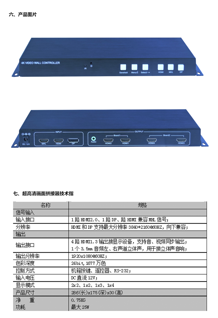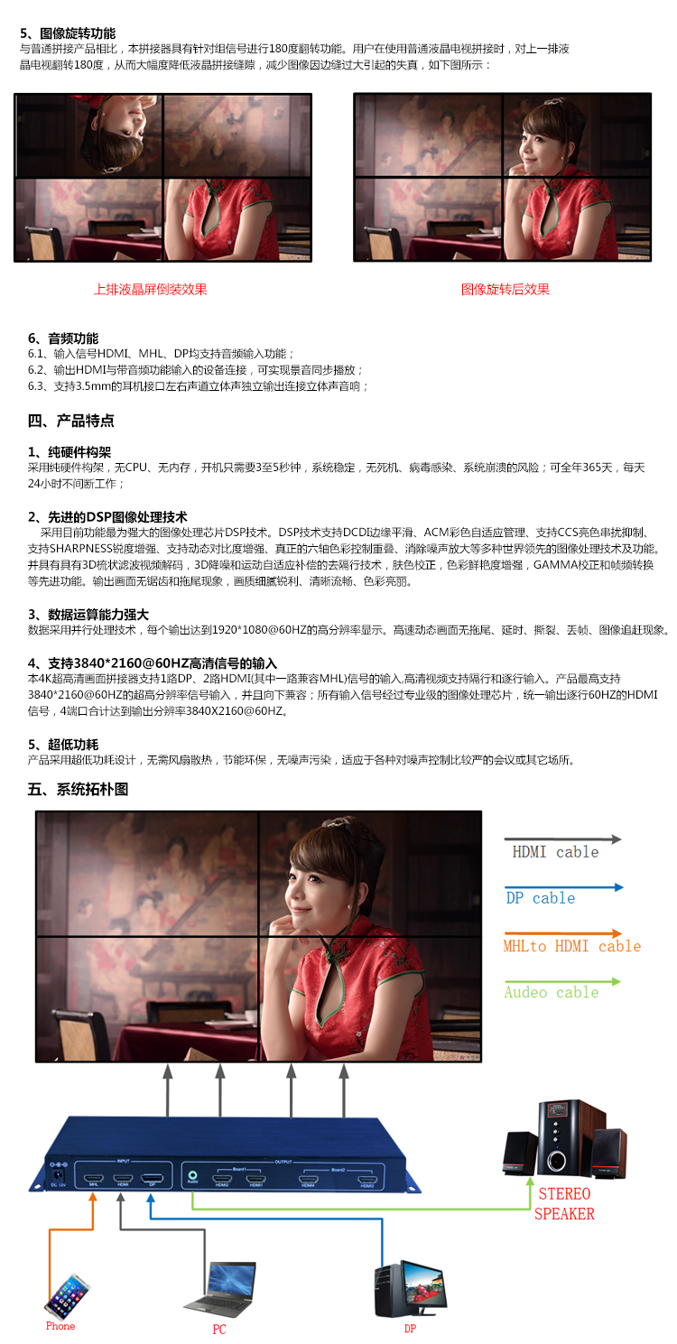 本產品是定制化的4K畫面拼接器,其主要功能是在M x N的拼接顯示單元上顯示一幅3840x2160@60HZ的超高清4K圖像。產品采用先進的圖像處理技術,輸入信號最大可以支持HDMI2.0,即3840x2160@60HZ,即使在播放快速動畫的時候也不會出現延時、丟幀現像。